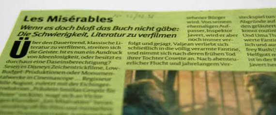 Für den Tagesspiegel ![]() Über den Dauertrend, klassische Literatur zu verfilmen, streiten sich die Geister. Ist es nun ein Ausdruck von Ideenlosigkeit, oder besitzt es durchaus eine Daseinsberechtigung? Seien es Disneys-Zeichentrickfilme, Low-Budget-Produktionen oder Monumentalwerke in Cinemascope... Regisseur Bille August, zuletzt mit der Eichinger-Produktion „Fräulein Smillas Gespür für Schnee“ im Kino, wagt sich nun an Victor Hugos Klassiker „Les Misérables“ heran. Das unzählig oft für Film und Fernsehen verfilmte Drama um Liebe, Leidenschaft, Ungerechtigkeit und Revolution steht zudem auch als Musical auf den Spielplänen in Städten wie Duisburg und London... Erzählt wird die Geschichte des Jean Valjean, der seit 19 Jahren als Zwangsarbeiter dahinvegetiert, bis er durch die Güte eines Bischofs das Geschenk der Freiheit erhält und ein angesehener Bürger wird. Von seinem ehemaligen Aufpasser, Inspektor Javert, wird er aber noch immer verfolgt und gejagt. Valjean verliebt sich schließlich in die völlig verarmte Fantine, und nimmt sich nach deren frühen Tod ihrer Tochter Cosette an. Nach abenteuerlicher Flucht und jahrelangem Versteckspiel tun sich am Ende menschliche Abgründe auf. Liam Neeson verkörpert den geläuterten Verbrecher Valjean gekonnt routiniert und durchaus glaubhaft. Und Uma Thurman ist als bemitleidenswerte Fantine ungewohnt leidenschaftlich und ausdrucksstark. Aber nur Geoffrey Rush (in „Shine“ als Pianist David Helfgott mit dem Oscar ausgezeichnet) ist in der Rolle des besessenen Polizisten Javert herausragend. Bleibt festzustellen, dass es der hochkarätigen Besetzung gelingt, Hugos Klassiker zu tragen und ihm ein Gesicht zu verleihen. Zumal August ihn als großes Kino inszeniert hat. So kann „Les Misérables“ durchaus als gelungene Literaturverfilmung angesehen werden. Doch ein Meisterwerk der Weltliteratur bleibt eben immer nur als Buch ein Meisterwerk. Les Misérables Deutschland/Großbritannien 1998 Regie: Bille August Darsteller: Liam Neeson, Uma Thurman... © Marcus Douale ONLINETEXTE